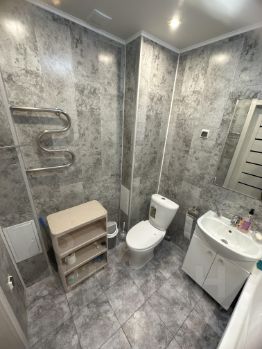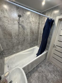 Косметический ремонт - стены ровные, окрашены; линолеум, в санузле напольная плитка+настенные панели; натяжной потолок с модными люстрами (2 секция).