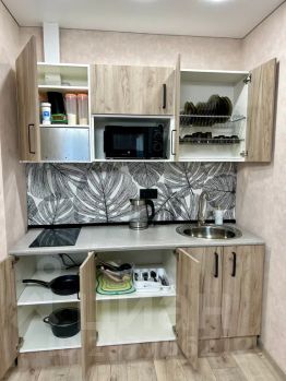 Варочная панель, вся необходимая посуда, и продукты первой необходимости: подсолнечное масло, чай, сахар, соль, перец, гречка, рис