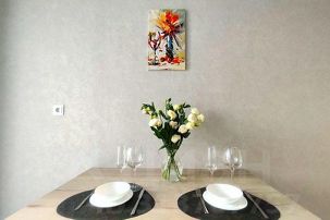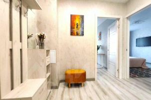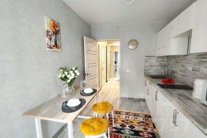 Квартира оснащена всей необходимой техникой: плита, микроволновая печь, холодильник. Также есть посуда и кухонные принадлежности. В основной комнате — двуспальный диван с ортопедическим матрасом и одноместный удобный диван. Санузел с душевой кабиной, туалетом и феном. Мы предоставляем чистое белье и полотенца.