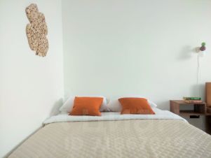 Изолированная спальня с двуспальной кроватью с ортопедическим матрасом и удобным двуспальным диваном.