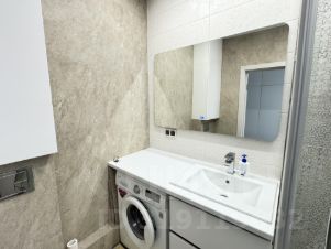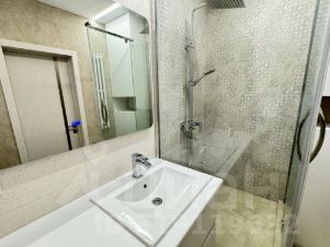 В санузле - стиральная машина, встроенная душевая кабина, подвесной унитаз, тумба под раковиной.