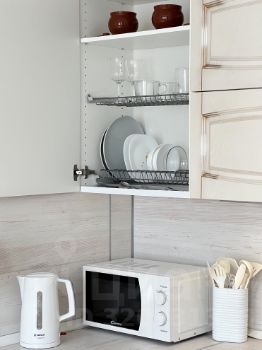 Варочная панель, духовой шкаф, микроволновая печь, чайник, холодильник, кухонная утварь, принадлежности и посуда