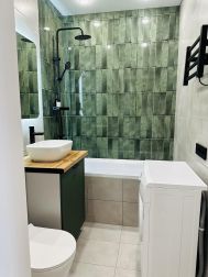 Санузел из керамогранита с ванной и стиральной машиной.