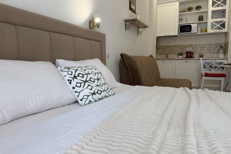 В апартаментах с удобством могут разместиться 3 человека на Ортопедической кровати king-sizе и ортопедическом раскладном диване.