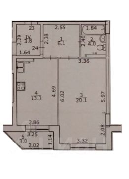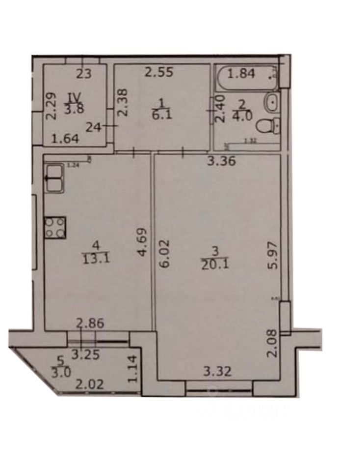 Общая площадь квартиры 43,4 кв.м,+ лоджия 3 кв м, кухня 13 кв м, комната 20 кв м, коридор 6 кв м, ванная комната 4 кв м.