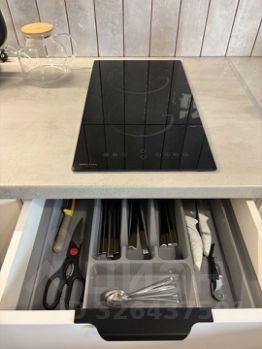Функциональная кухня: холодильник, варочная панель, микроволновая печь, чайник, кофемашина и вся необходимая посуда