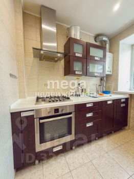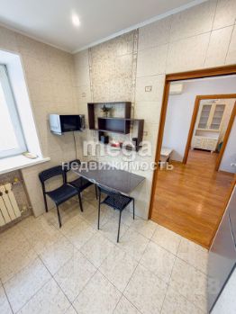 Кухонный гарнитур с удобной системой хранения, стол и стулья на кухне. В комнате: двуспальная кровать, прикроватные тумбочки, рабочий стол, комод, шкаф.