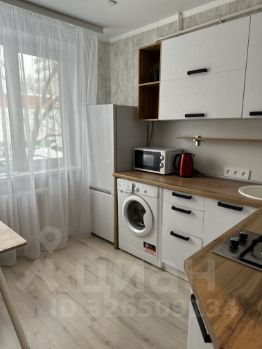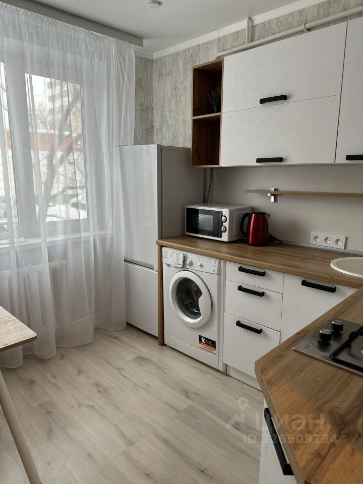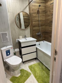 Кухня оснащена всем необходимым: холодильником, плитой, микроволновой печью и стиральной машиной. Есть обеденный стол и стулья. Ванная комната совмещённая, с современной сантехникой и стильным оформлением.