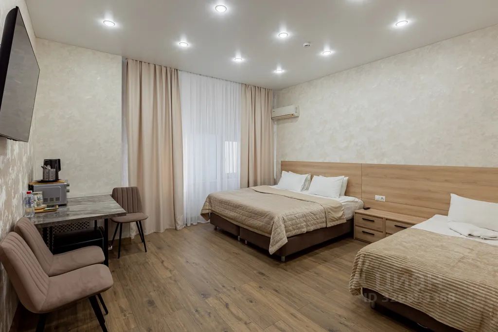 Просторный комфортный номер с одной большой и одной одноместной кроватью с возможностью доп. места и трансформации кроватей отлично подойдет для размещения группы или семьи. Здесь есть все необходимое для комфортного пребывания: удобные кровати, зона приема пищи, чайный набор, микроволновка и холодильник. Номер оснащен собственной ванной комнатой с набором полотенец и средств индивидуальной гигиены
