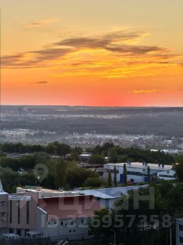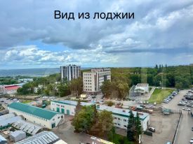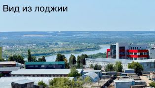 Большая лоджия с видом на реку, лес и город.