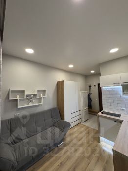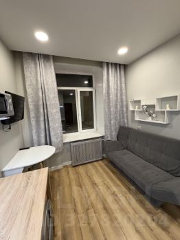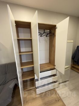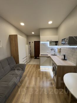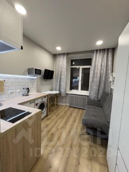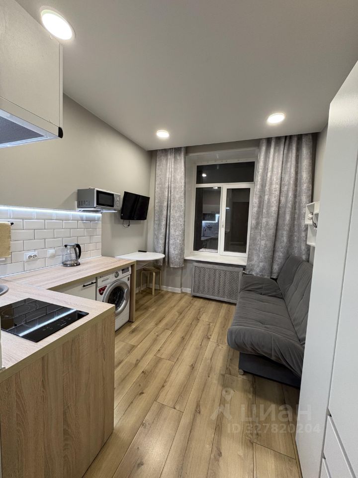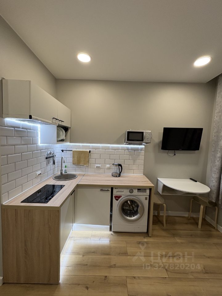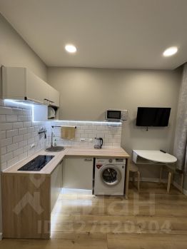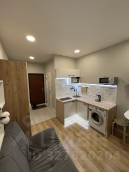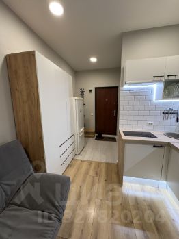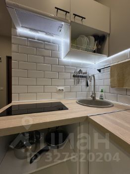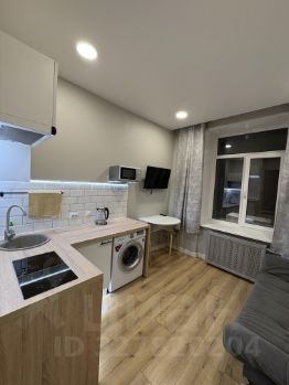 На фото вся техника в рабочем состоянии, мебель почти вся новая, кухонный гарнитур компактный , но вместительный и функциональный, электрическая варочная панель , над ней рабочая вытяжка,что очень удобно для студий, набор кухонной утвари имеется.