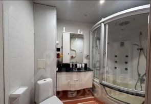 Сан узел совмещенный. Несколько небольших шкафов для хранения. Большая душевая кабина, вмещающая ванну с джакузи.