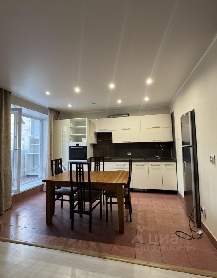 Зал + кухня. Оснащена всем необходимым. Стол деревянный, 4 стула, большой диван с антивандальной обивкой, современный кухонный гарнитур в светлых оттенках, большой встроенный холодильник, каменная раковина с удобным краном и спец душем, встроенная посудомоечная машина, плита, печь с функцией гриля, стиральная машина. Отдельно стоящая микроволновая печь. Окна в пол и выход на балкон. Возможен косметический ремонт.
