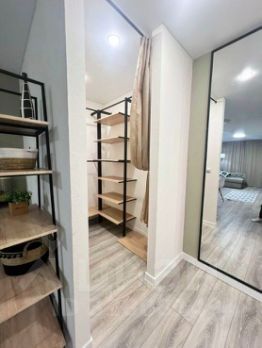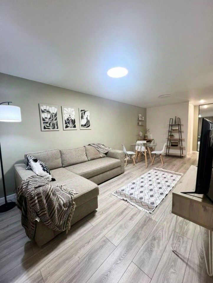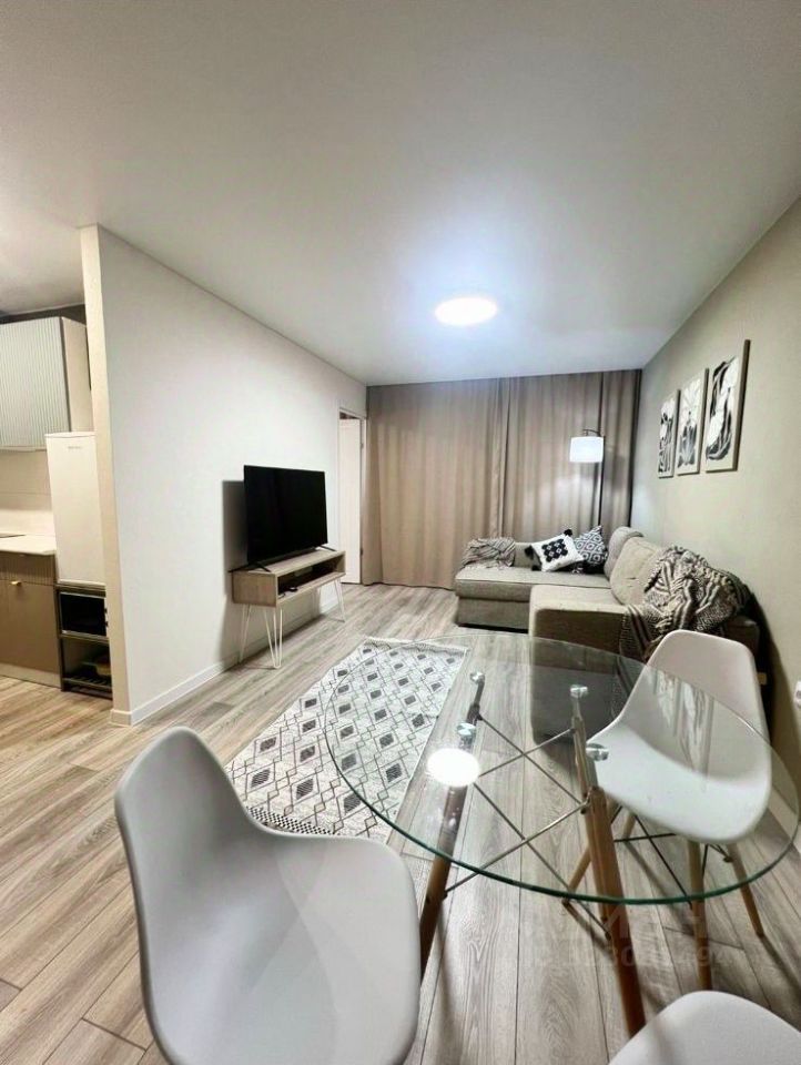 Для комфортного проживания имеется вся необходимая мебель и бытовая техника. Двуспальная кровать, гардеробная, стиральная машина-автомат, холодильник, СВЧ-печь, эл. чайник, кухонный гарнитур, диван, стеллажи, торшер, точечные светильники, обеденный стол, стулья.