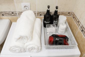 Гель для душа, шампунь, зубная паста, жидкое мыло и прочие мелочи. Фен тоже