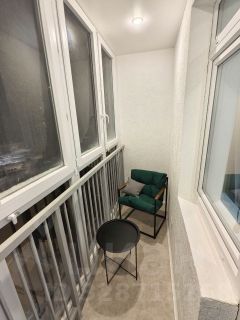 Из комнаты можно выйти на лоджию, оборудованную под комфортную зону отдыха, с креслом и столиком. Есть полноценное освещение.