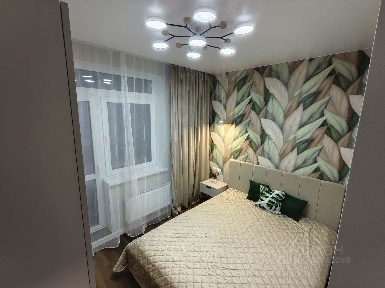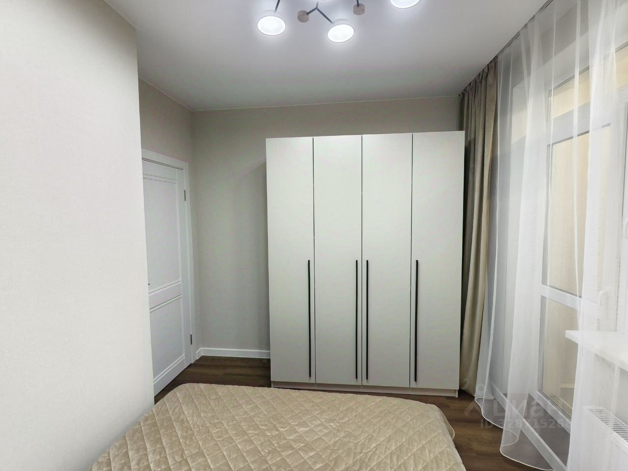 Спальня светлая с двуспальной кроватью. Установлены вместительный шкаф для хранения вещей, прикроватная тумба. Есть прикроватное освещение.