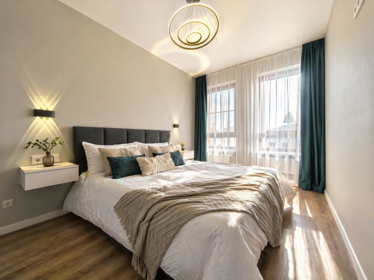 Широкая двуспальная кровать с чистым белым постельным бельём.