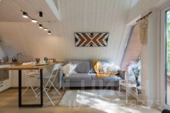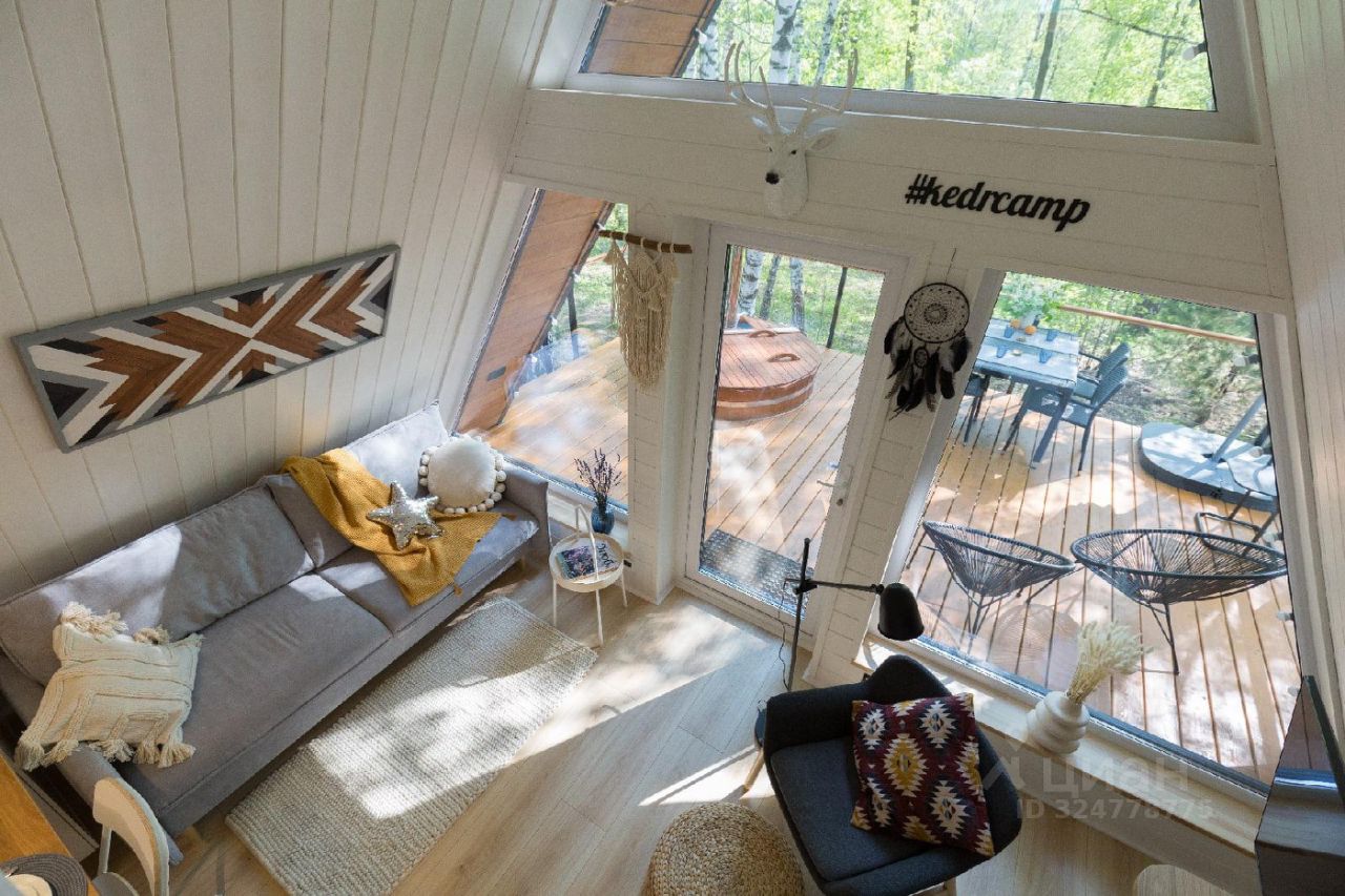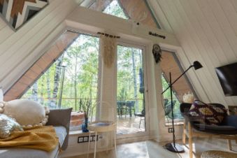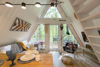 Интерьер домика выполнен в настоящем сканди-стиле со множеством интересных деталей и аксессуаров. В интерьере преобладают мягкие кремовые оттенки.
