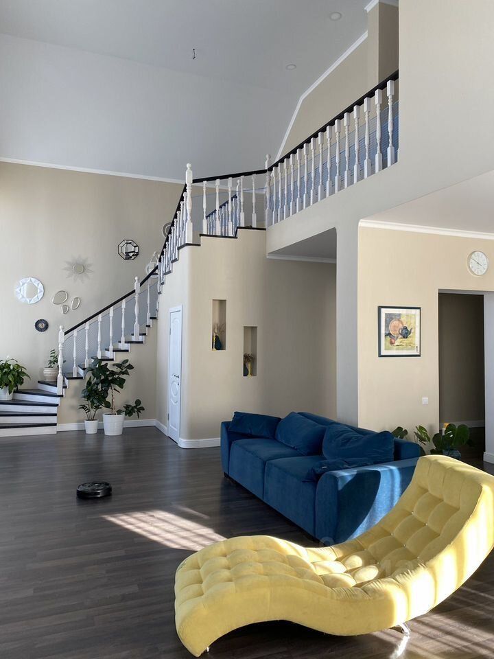 В доме расположена огромная гостиная, совмещенная с кухней, высота потолков которой достигает 6 метров. Это идеальное пространство для большой семьи.