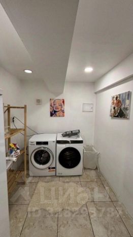 Из гостиной ведет дверь на цокольный этаж, где расположена полноценная прачечная со стиральной и сушильной машиной. Это отдельная зона для стирки и хранения бытовых принадлежностей, позволяющая поддерживать порядок в основных жилых комнатах.