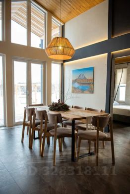 Гостиная оборудована двумя диванами 90х200 см каждый, ТВ, экокамином, обеденным столом 90х180 см, с возможностью размещения до 11 человек: 8 взрослых и 2 ребёнка.
