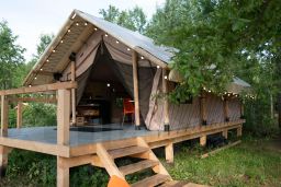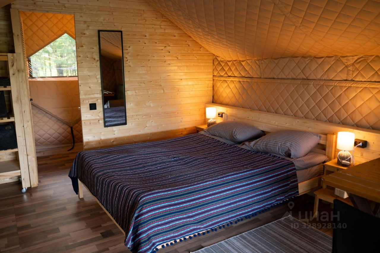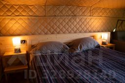 Комфортабельная палатка включает в себя спальную зону с двуспальной кроватью, гардеробной, мини-кухню и террасу с видом на водную гладь. Дополнительное спальное место - диван. При заезде гостям выдается ключ от индивидуальной душевой кабины и уборной, которые расположены в отдельном сооружении.