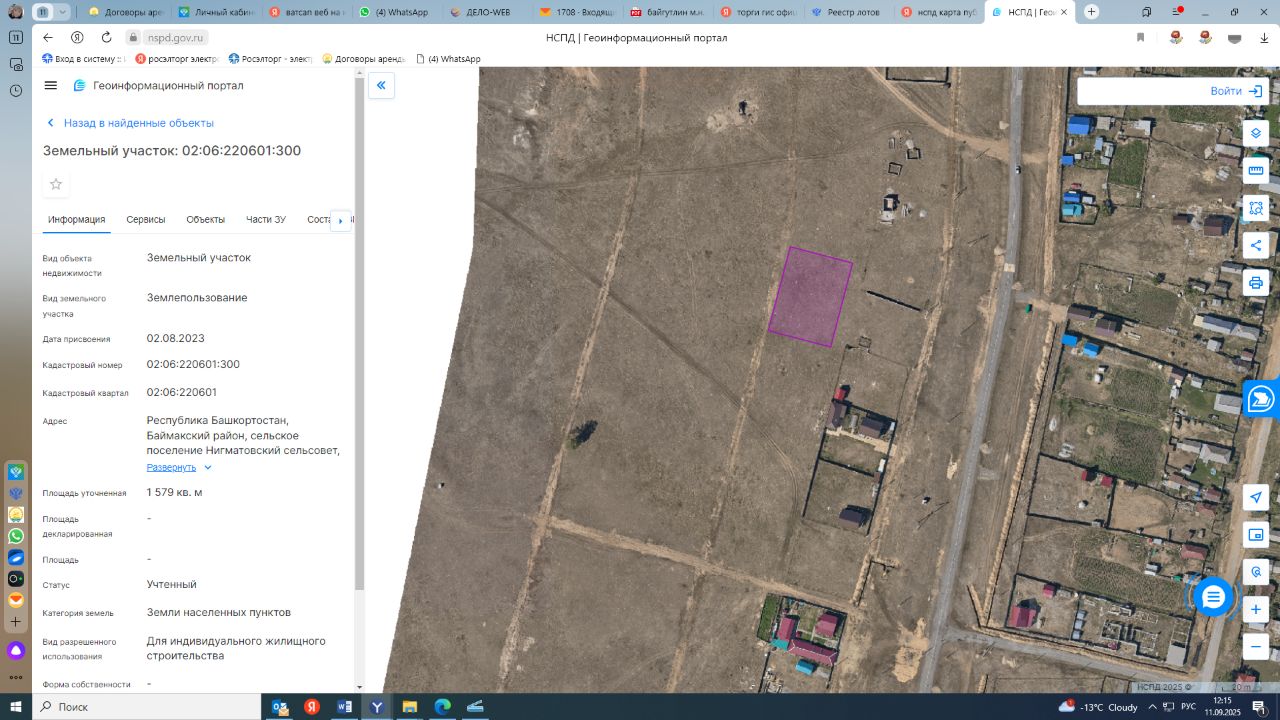 земельный участок категории земли населенных пунктов, с кадастровым номером 02:06:220601:300, общей площадью 1579 кв.м., расположенного по адресу: Республика Башкортостан, Баймакский район, сельское поселение Нигаматовский сельсовет, деревня Исяново, улица Талкас, с видом разрешенного использования: для индивидуального жилищного строительства.