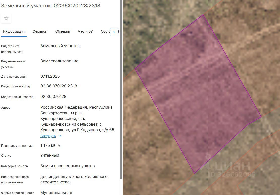 Земельный участок с кадастровым номером 02:36:070128:2318 площадь 1175 по адресу Российская Федерация, Республика Башкортостан, м.р-н Кушнаренковский, с.п. Кушнаренковский сельсовет, с Кушнаренково, ул Г.Кадырова, з/у 65