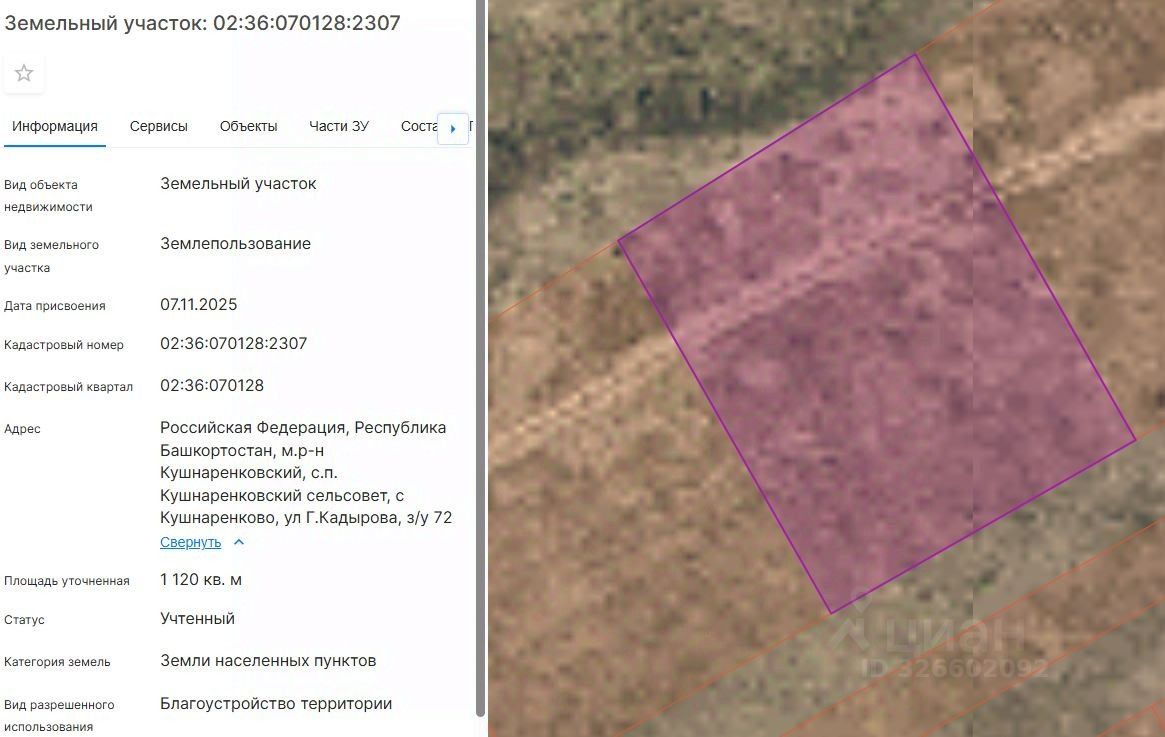 Земельный участок с кадастровым номером 02:36:070128:2307 площадь 1120 по адресу Российская Федерация, Республика Башкортостан, м.р-н Кушнаренковский, с.п. Кушнаренковский сельсовет, с Кушнаренково, ул Г.Кадырова, з/у 72