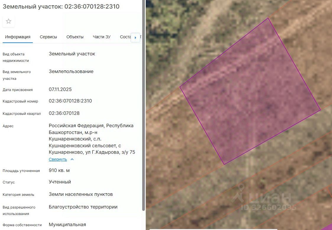 Земельный участок с кадастровым номером 02:36:070128:2310 площадь 910 по адресу Российская Федерация, Республика Башкортостан, м.р-н Кушнаренковский, с.п. Кушнаренковский сельсовет, с Кушнаренково, ул Г.Кадырова, з/у 75