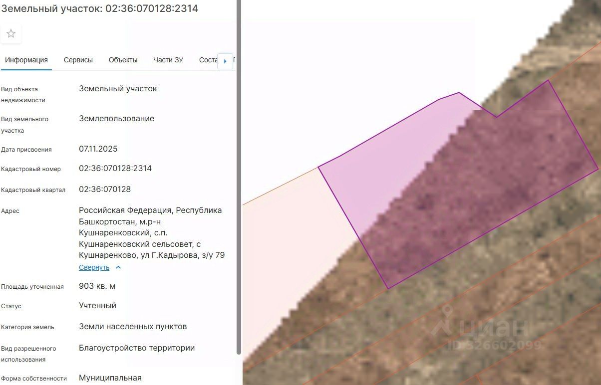 Земельный участок с кадастровым номером 02:36:070128:2314 площадь 903 по адресу Российская Федерация, Республика Башкортостан, м.р-н Кушнаренковский, с.п. Кушнаренковский сельсовет, с Кушнаренково, ул Г.Кадырова, з/у 79