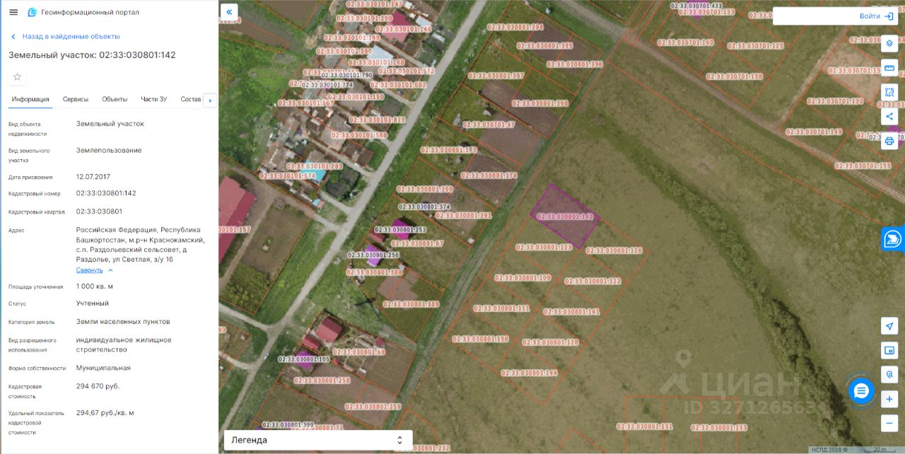 Категории земель земли населенных пунктов; Кадастровый номер 02:33:030801:142; Площадь 1000 кв.м; Расположенный по адресу: РРеспублика Башкортостан, м.р-н Краснокамский, с.п. Раздольевский сельсовет, д Раздолье, ул Светлая, з/у 16; Вид разрешенного использования индивидуальное жилищное строительство. Участок свободен от прав третьих лиц. Согласно сведениям ЕГРН ограничения участка отсутствуют.
