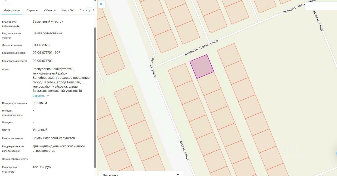 Земельный участок, категории земель населенных пунктов с кадастровым номером 02:09:071701:1907, площадью 900 кв. м, местоположение установлено относительно ориентира, расположенного в границах участка, почтовый адрес ориентира: Российская Федерация, Республика Башкортостан, м.р-н Белебеевский, г.п. город Белебей, г.Белебей, мкр. Чайковка, ул.Восьмая, з/у 18, с видом разрешенного использования "Для индивидуального жилищного строительства".