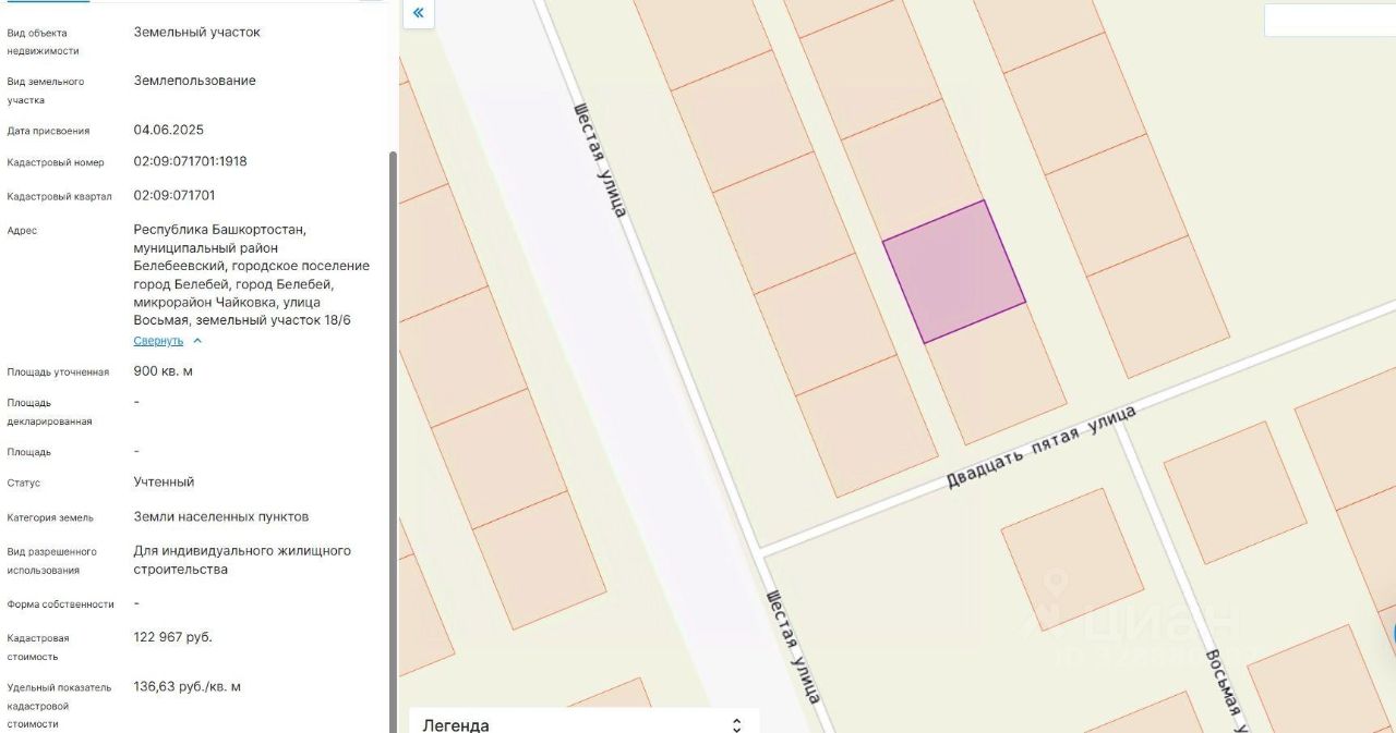 Земельный участок, категории земель населенных пунктов с кадастровым номером 02:09:071701:1918, площадью 900 кв. м, местоположение установлено относительно ориентира, расположенного в границах участка, почтовый адрес ориентира: Российская Федерация, Республика Башкортостан, м.р-н Белебеевский, г.п. город Белебей, г.Белебей, мкр. Чайковка, ул.Восьмая, з/у 18/6, с видом разрешенного использования "Для индивидуального жилищного строительства".