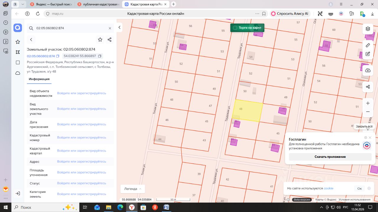 Земельный участок по адресу: РБ, Аургазинский район, село Толбазы, ул. Трудовая д.48, с кадастровым номером 02:05:060802:874