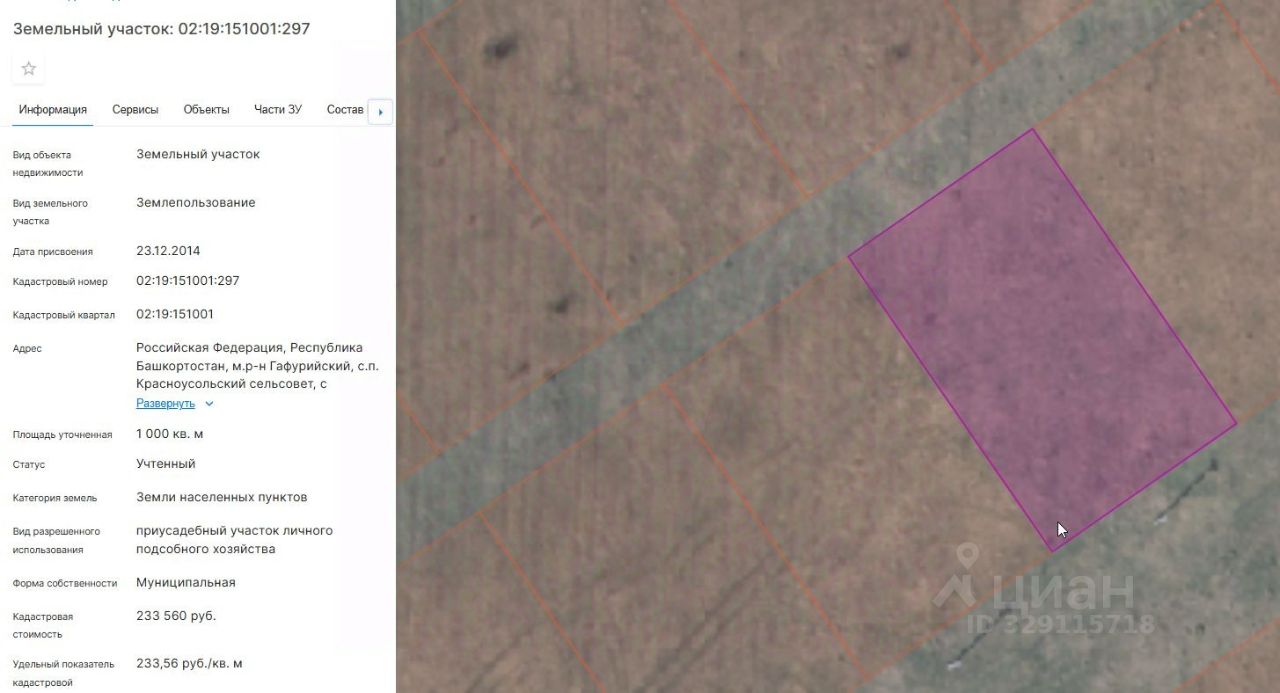 Земельный участок с кадастровым номером 02:19:151001:297, площадью 1000 кв. м, расположенного по адресу: Республика Башкортостан, Гафурийский район, с/с Красноусольский, с. Красноусольский, ул. Радужная, з/у. 27, с видом разрешенного использования "приусадебный участок личного подсобного хозяйства"