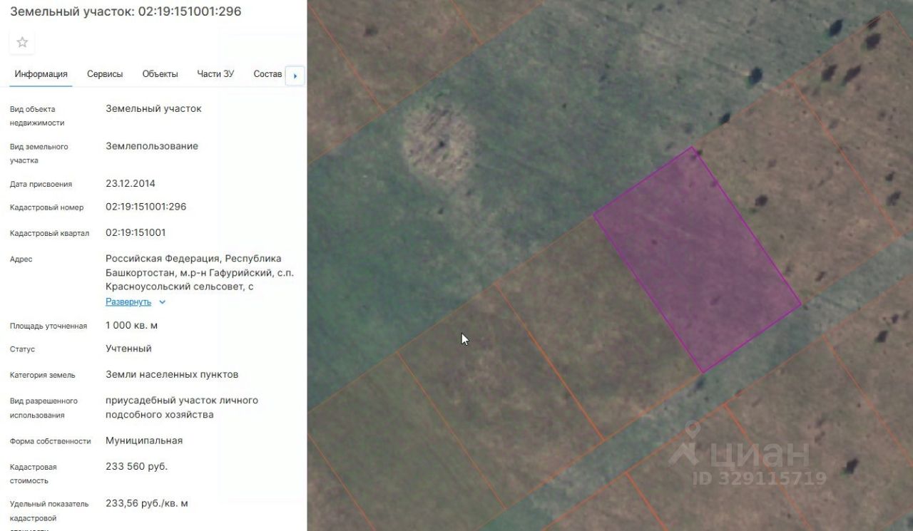 Земельный участок с кадастровым номером 02:19:151001:296, площадью 1000 кв. м, расположенного по адресу: Республика Башкортостан, Гафурийский район, с/с Красноусольский, с. Красноусольский, ул. Лазурная, з/у. 48, с видом разрешенного использования "приусадебный участок личного подсобного хозяйства"