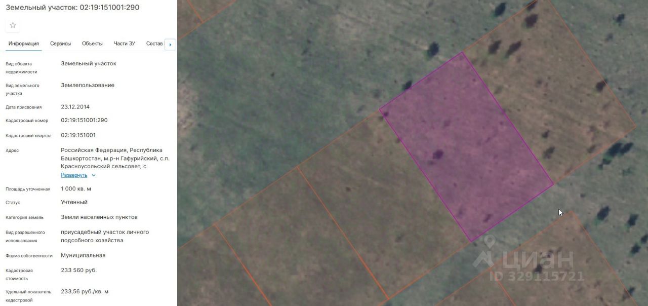 Земельный участок с кадастровым номером 02:19:151001:290, площадью 1000 кв. м, расположенного по адресу: Республика Башкортостан, Гафурийский район, с/с Красноусольский, с. Красноусольский, ул. Лазурная, з/у. 50, с видом разрешенного использования "приусадебный участок личного подсобного хозяйства"