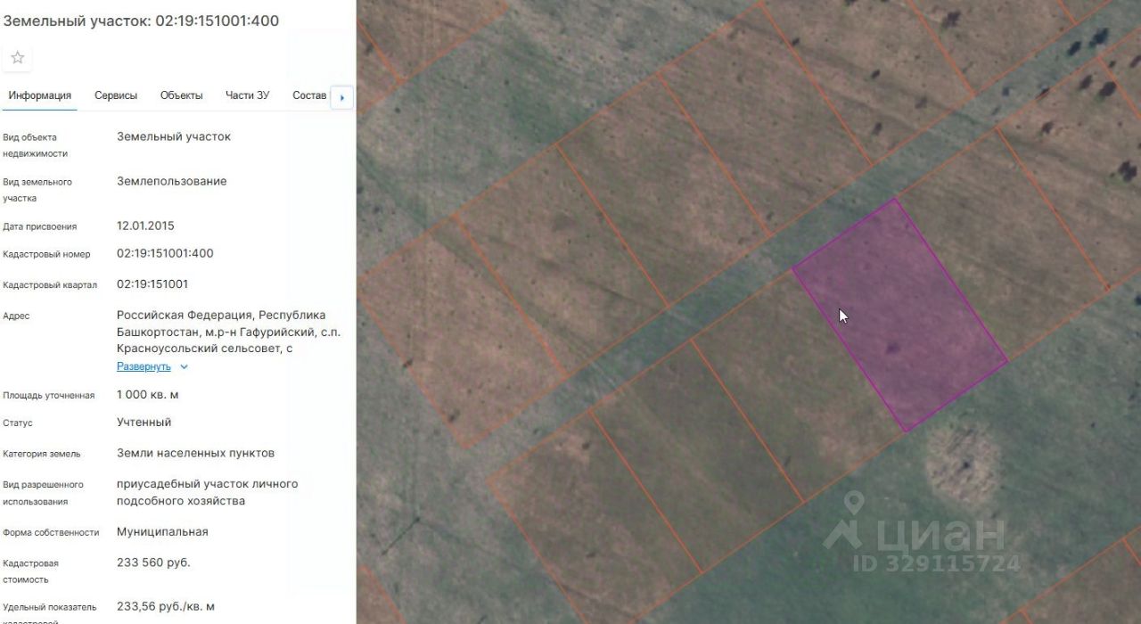 Земельный участок с кадастровым номером 02:19:151001:400, площадью 1000 кв. м, расположенного по адресу: Республика Башкортостан, Гафурийский район, с/с Красноусольский, с. Красноусольский, ул. Лазурная, з/у. 45, с видом разрешенного использования "приусадебный участок личного подсобного хозяйства"