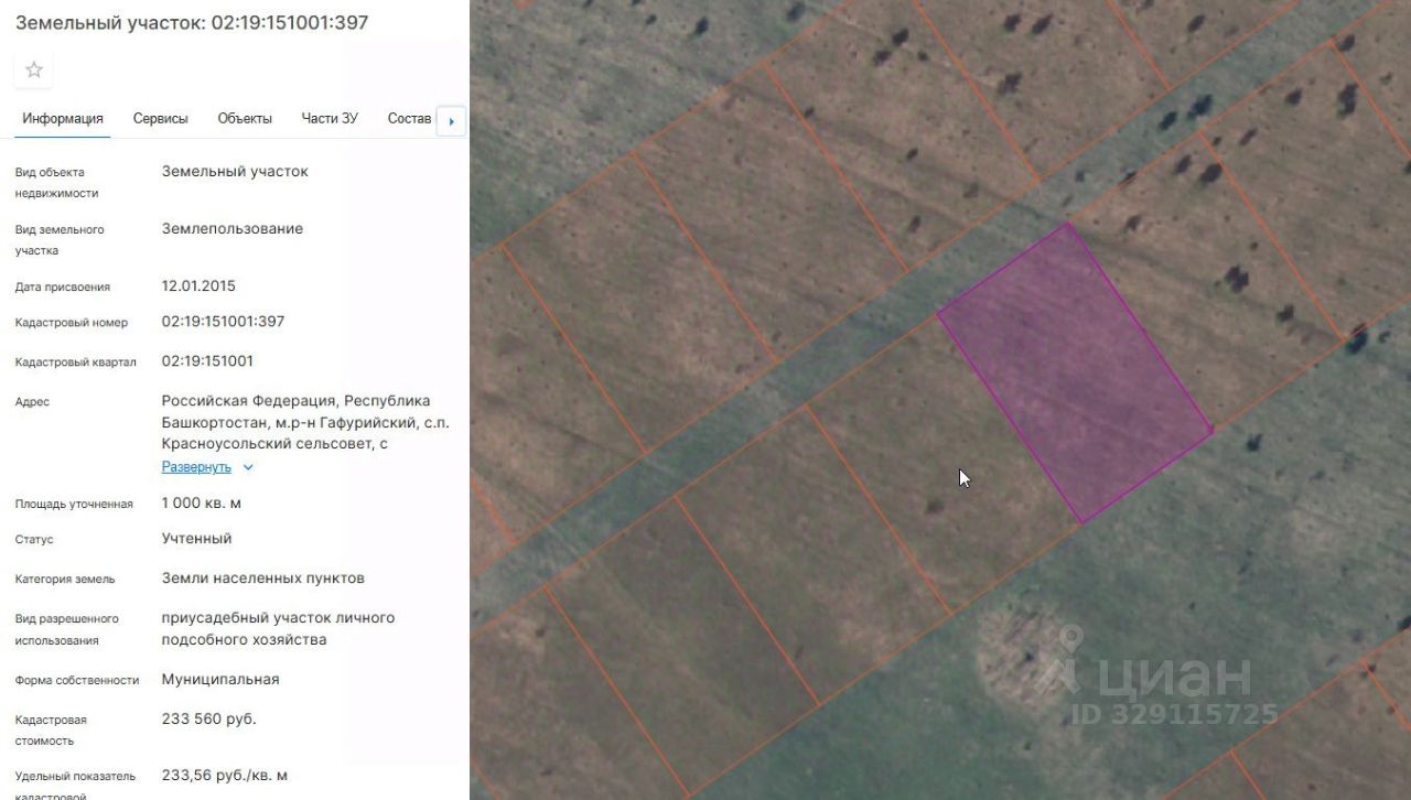 Земельный участок с кадастровым номером 02:19:151001:397, площадью 1000 кв. м, расположенного по адресу: Республика Башкортостан, Гафурийский район, с/с Красноусольский, с. Красноусольский, ул. Лазурная, з/у. 47, с видом разрешенного использования "приусадебный участок личного подсобного хозяйства"
