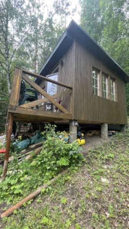 с новым домом 35 м2 по каркасной технологии утепленный для проживания в зимний период, в доме имеется санузел, кухонный гарнитур со всем необходимым , газовая плита, отопление газовое, панорамные окна с прекрасным видом, террасой, полностью мебелирован, все новое, купили и установили в 24 году, электричество от генератора, готов к проживанию .