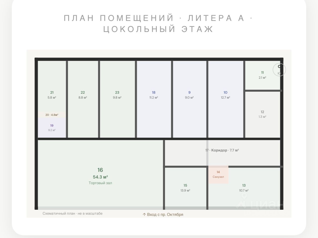 — Планировка: 15 помещений — торговые залы, комнаты обслуживания клиентов, демонстрационный зал, склад, санузел, коридоры