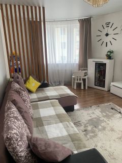 Натяжной потолок, плитка в ванной и туалете. В квартире остается кухонный гарнитур с варочной панелью и духовкой, посудомойка, 3 встроенных шкафа и кондиционер. На балконе имеется шкаф, в котором легко помещаются зимние шины от кроссовера и прочие вещи. В зале произведено зонирование комнаты с помощью реек (можно сделать детскую или мини-кабинет). На батареях есть регуляторы, дом теплый, поэтому чаще всего открыты на самый минимум.