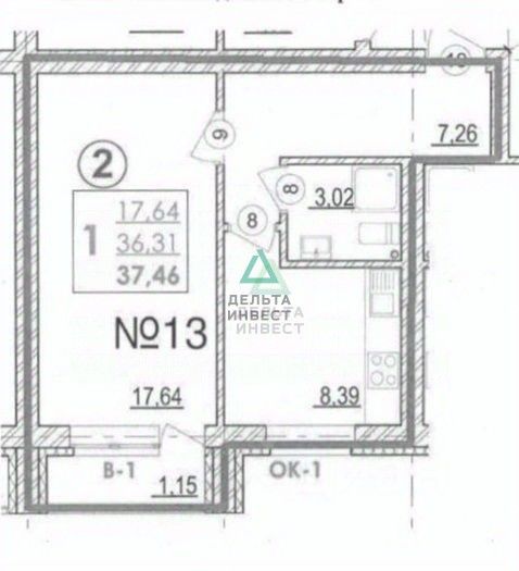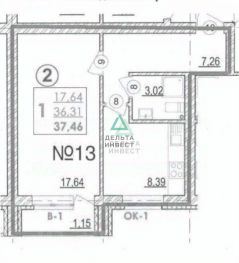 Квартира на 4 этаже 5-тиэтажного кирпичного дома. Общая площадь 37.46 кв.м., жилая площадь 17.64 кв.м., кухня 8,39 кв.м. Выход на балкон из зала, окна выходят в сторону зеленого массива. Высота потолков - 2,7 м.