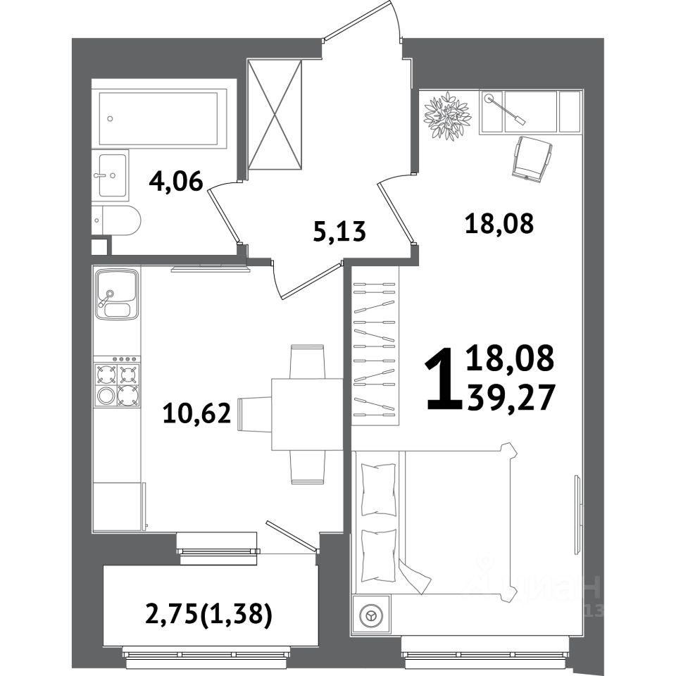 - общая площадь квaртиpы 39.27 кв.м.,