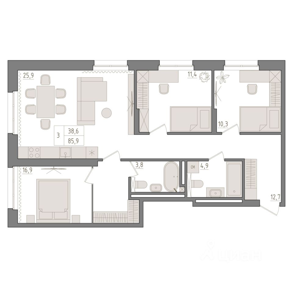 4-й этаж 23 - этажного жилого дома, общая площадь 85.9 кв. м., жилая площадь 38.6 кв. м. Срок окончания строительства: 1 квартал 2029 года