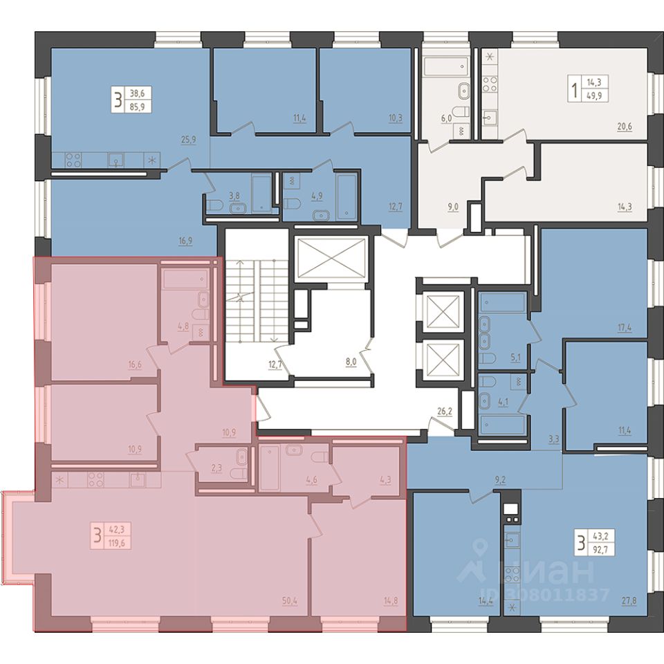 19-й этаж 23 - этажного жилого дома, общая площадь 119.6 кв. м., жилая площадь 42.3 кв. м. Срок окончания строительства: 1 квартал 2029 года