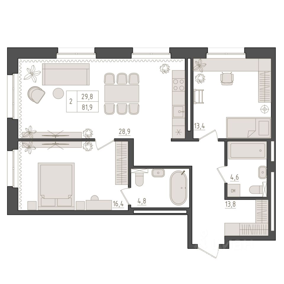 2-й этаж 18 - этажного жилого дома, общая площадь 81.9 кв. м., жилая площадь 29.8 кв. м. Срок окончания строительства: 1 квартал 2029 года