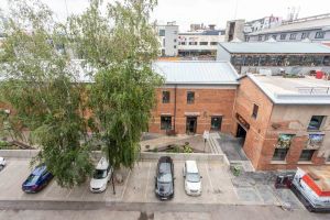 кирпичный дом, во дворе парковка под шлагбаумом